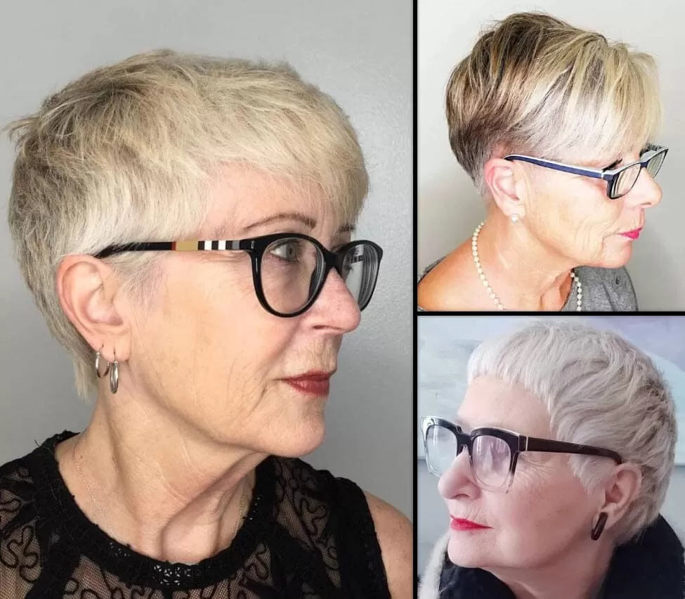 Flotte Kurzhaarfrisuren ab 60 mit Brille: Texturierter Pixie, Eleganter Buzz Cut und Stacheliger Charme